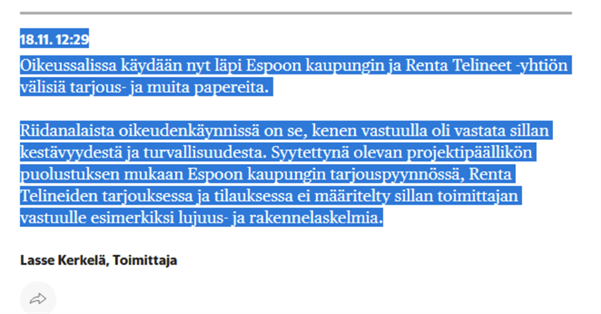 Yllä olevassa tekstissä (kuvakaappaus HS-artikkelista) on paljon huomionarvoista asiaa takana, jotka eivät näy päällepäin. Tilaaja tilaa telineet ja toimittaja toimittaa telineet, mutta mitkä ovat vaatimukset näille telineille?